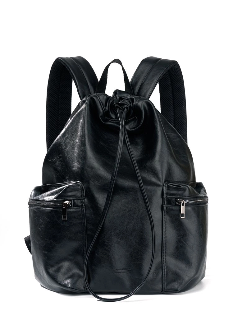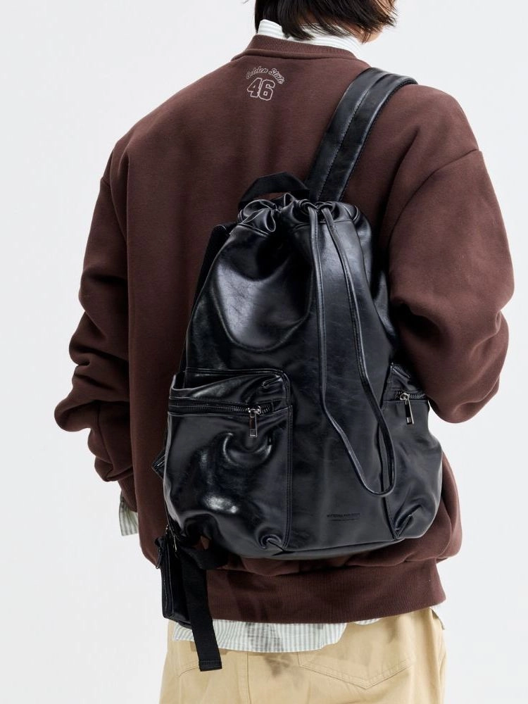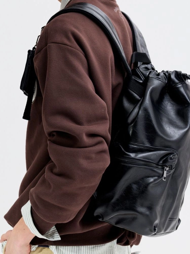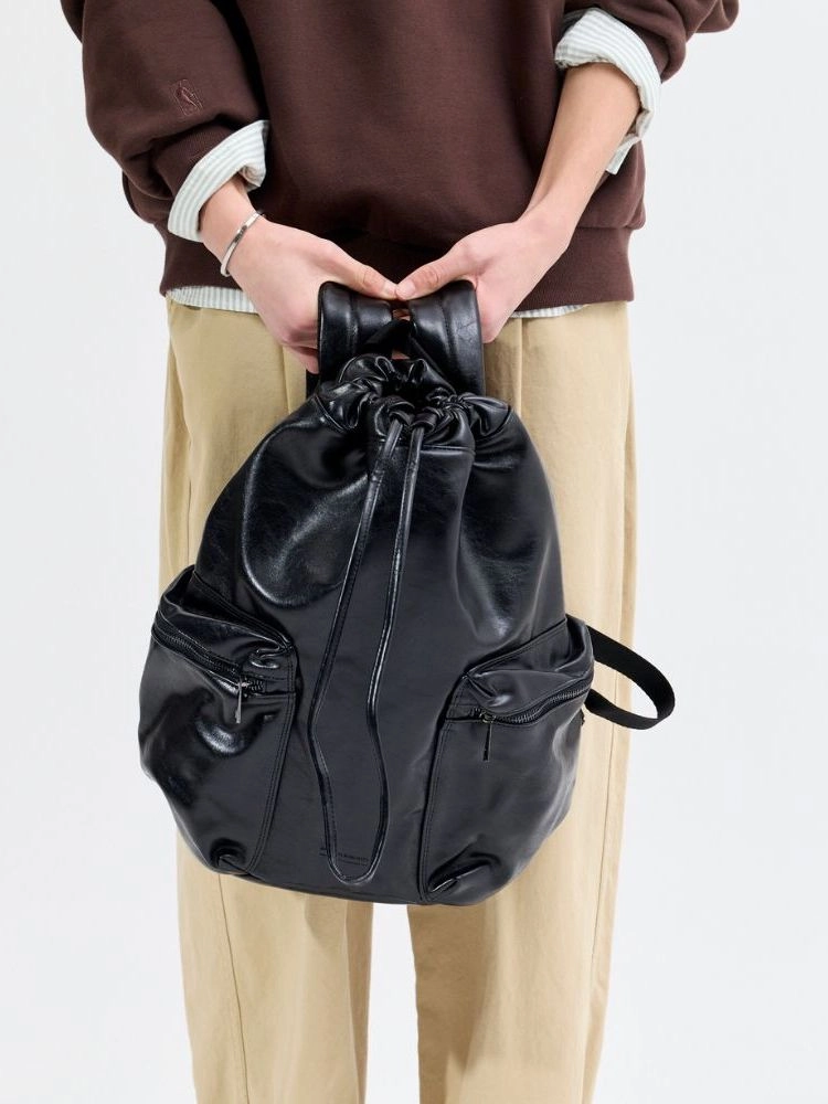 크랙 무늬의 합성피혁 소재로 제작된 백팩입니다. 제원단 스트링으로 여닫을 수 있으며, 넉넉한 수납공간으로 실용성을 높였습니다.