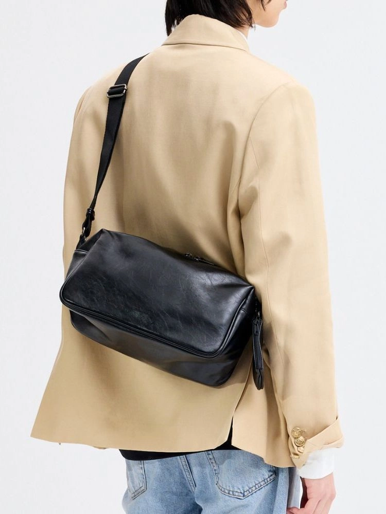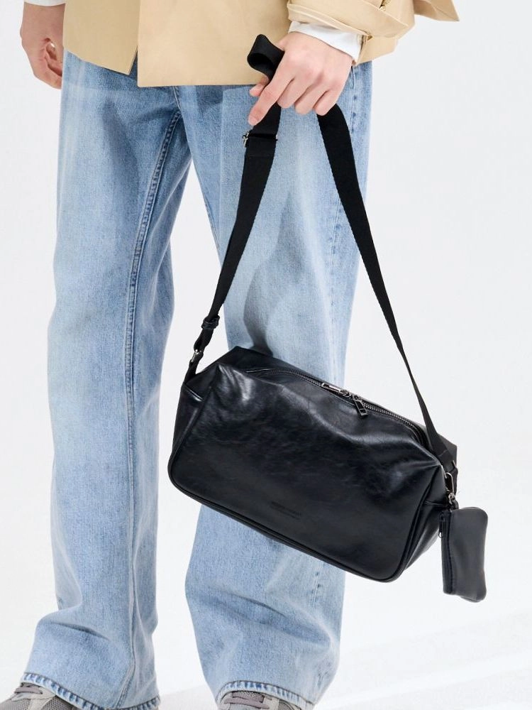 빈티지한 크랙 무늬가 돋보이는 합성피혁 소재의 직사각형 형태의 크로스백입니다. 넉넉한 수납공간에 활용도 높은 미니 파우치가 함께 달려있어 편리함을 더했습니다.