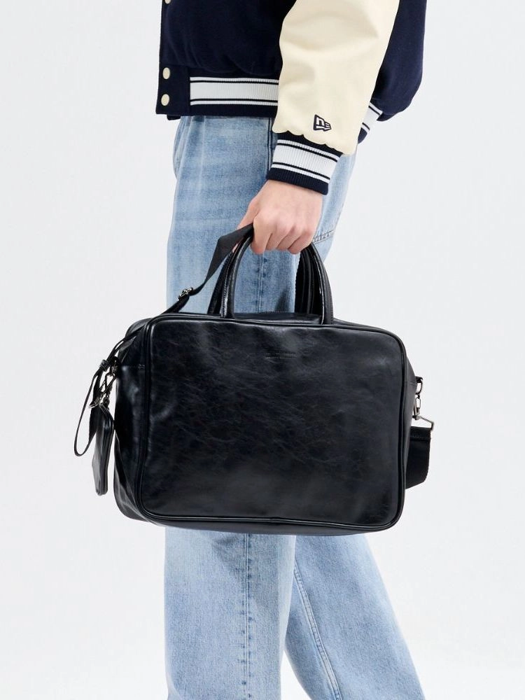 빈티지한 크랙 무늬의 합성피혁 소재로 제작된 크로스백입니다. 손잡이가 달려 있어 토트백으로도 연출 가능하며, 스트랩을 활용해 크로스백으로도 사용할 수 있습니다.